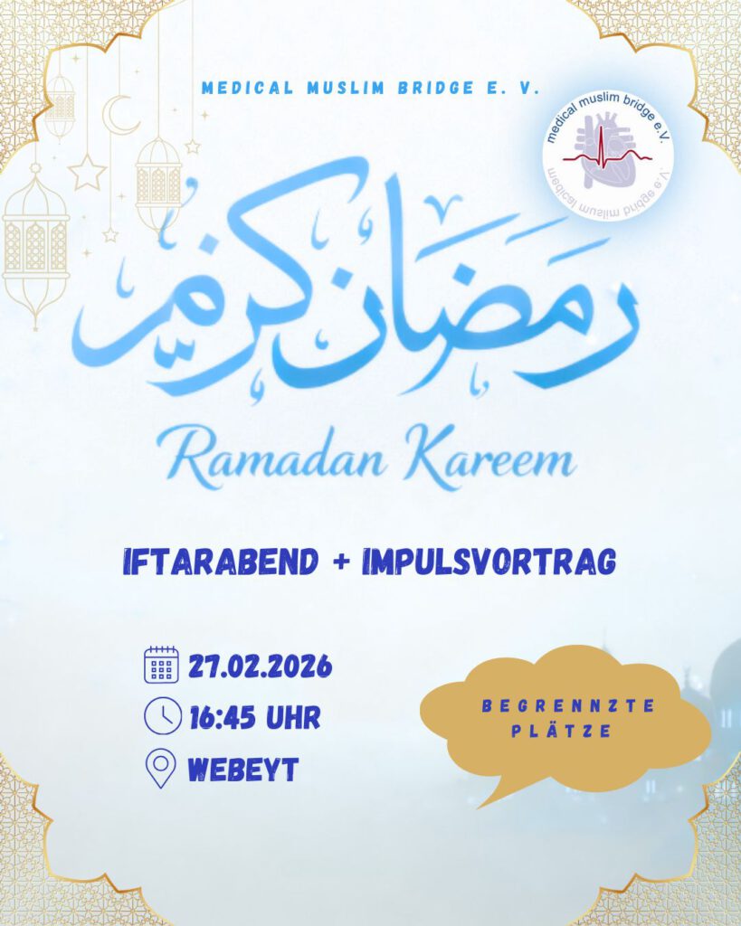 Menü Startseite Mitglied werden Spenden medical muslim bridge e.V. Mitmachen. Vernetzen. Spaß haben – wir freuen uns auf dich! Jetzt Mitglied werden Unsere Nächste Veranstaltung Brüdertreff Datum: 11.12.25 Uhrzeit:17:00Uhr Ort: Unser VereinsraumMenzelstraße 18, 45147 EssenWir freuen uns auf euch! Hier anmelden! ↓Alles im Überblick↓ Kinderfeste im Uniklinikum Zum Ablauf Über uns/Vorstand Wie der Verein entstanden ist Spenden Wo deine Spenden landen Gebetsraum am Uniklinikum Weitere Informationen Muslimische Seelsorge Arbeitsalltag und der nächste Ausbildungsgang Mentoringprogramm Anmeldung und Ablauf Auch auf Instagram findet ihr uns unter @medicalmuslimbridgeHier werden die neuesten Aktivitäten angekündigt. Alte Veranstaltungen lassen wir hier Revue passieren. 🌙✨ Save the Date – Iftar 2026 ✨🌙 Wir f ••• Im Medizinstudium waren wir alle einmal Assalamu alaikum liebe Mitglieder, Medizinerinnen ‼️‼️Terminänderung: 16.10-->17.10 Liebe M Rückblick auf unser Grilltreffen🍗✨ Alhamdul Hier gehts auf Instagram weiter Hast du Fragen oder Anregungen? Hier kannst du uns per Email kontaktieren. Wir freuen uns über jede Nachricht! Name E-Mail-Adresse Nachricht (optional) Copyright © 2025 medical muslim bridge e.V. Impressum Datenschutz